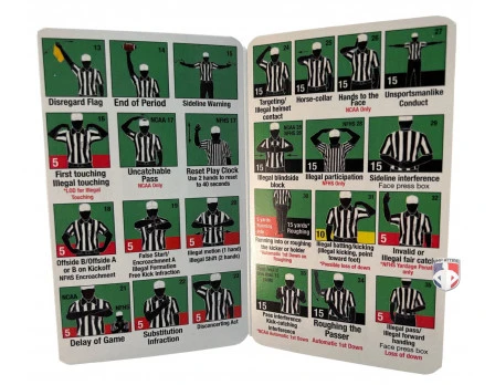 Put 47 full-color NCAA & NFHS football referee penalty signals and their yardages in your pocket with this easy-to-read large format, bi-fold reference tool. This durable, waterproof card will last many seasons and is great for officials at the college and high school levels.